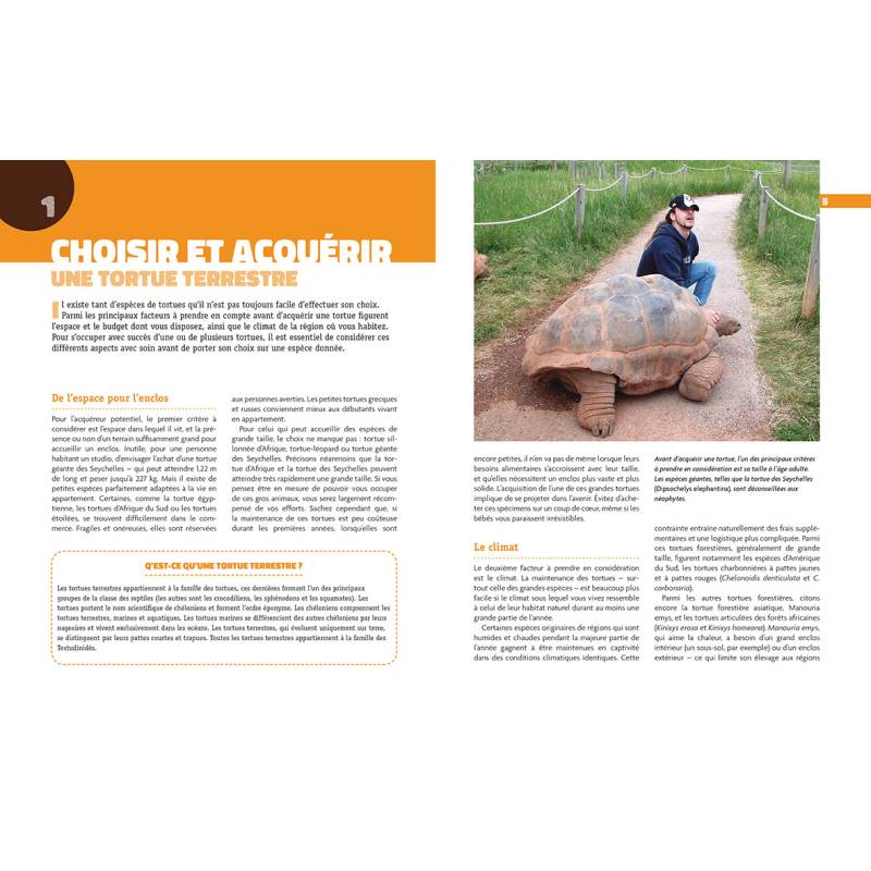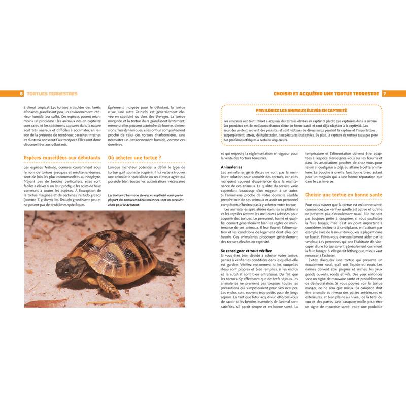 Reptiles les plus vendus en animalerie, les tortues terrestres comptent de nombreuses espèces, toutes traitées dans cet ouvrage : tortue russe, tortue grecque, tortue d'Hermann, tortue-léopard, etc.