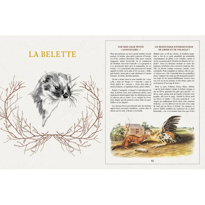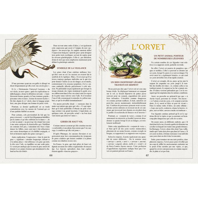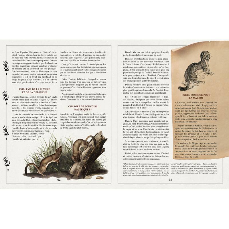 - Une cinquantaine d'animaux (de la belette, au loup en passant par la chouette) analysée, dévoilant les histoires, superstitions et symboles qui leur sont associés, parfois encore ancrés dans notre imaginaire collectif.