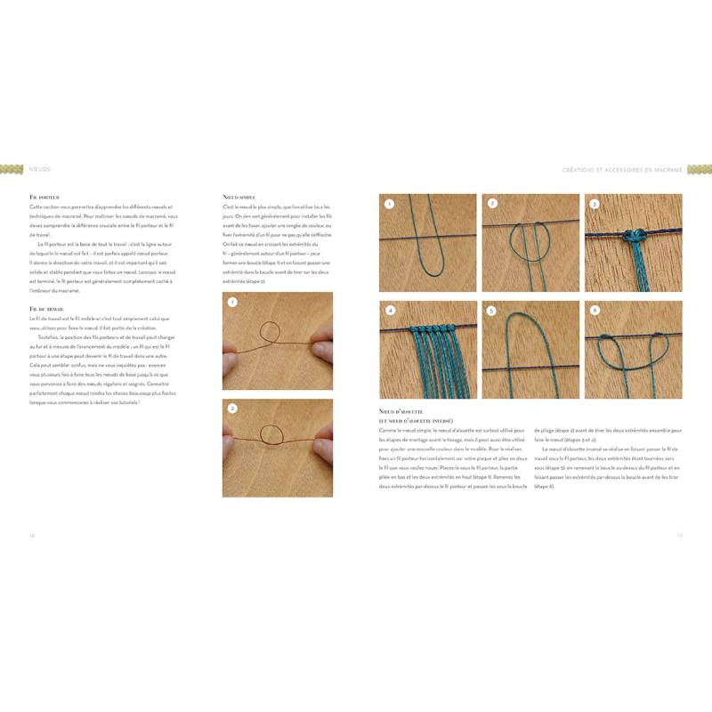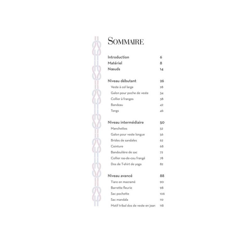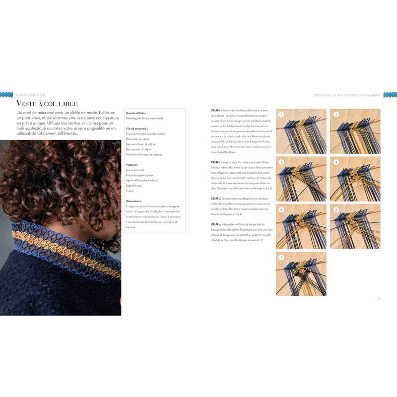 17 projets originaux en macramé pour la garde-robe : col, collier, bandeau, tongs, manchettes, ceinture, dos de T-shirt, sac, et bien d'autres.