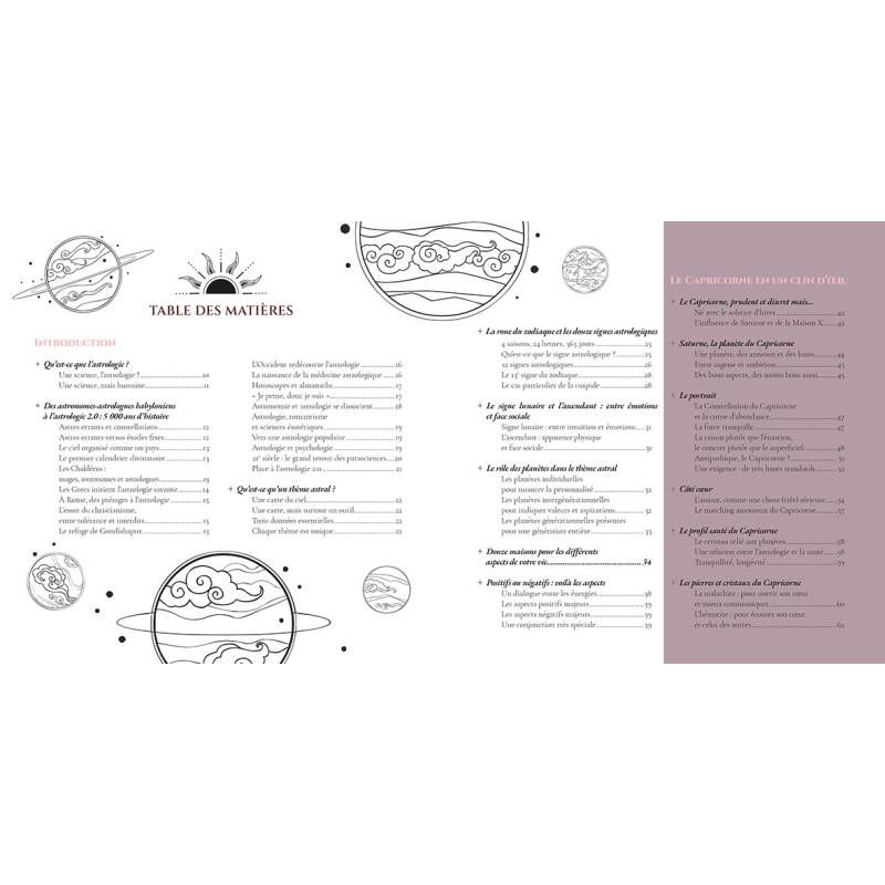 Le petit cahier pour tout savoir sur son signe astrologique : traits de person-nalité, caractéristiques générales, planètes d'influence, élément correspon-dant, relation avec le travail, l'amour, la santé, les défauts et les qualités, les affinités avec d'autres signes, etc.