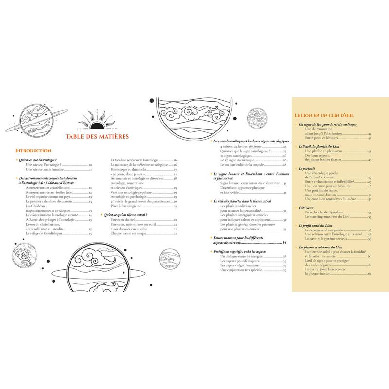 Le petit cahier pour tout savoir sur son signe astrologique : traits de person-nalité, caractéristiques générales, planètes d'influence, élément correspon-dant, relation avec le travail, l'amour, la santé, les défauts et les qualités, les affinités avec d'autres signes, etc.