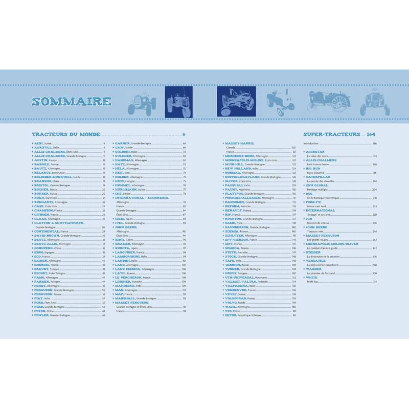 L'histoire et les modèles de 100 marques de tracteurs de légende : création de la marque, succès et échecs, caractéristiques techniques des modèles, etc.