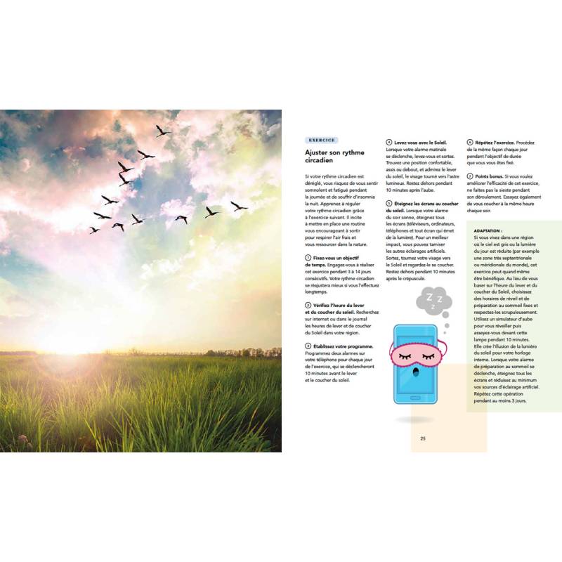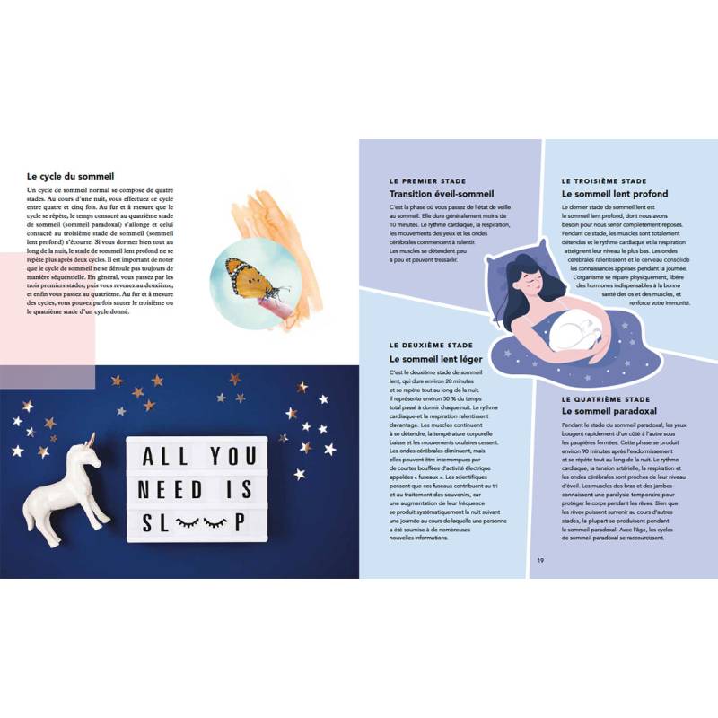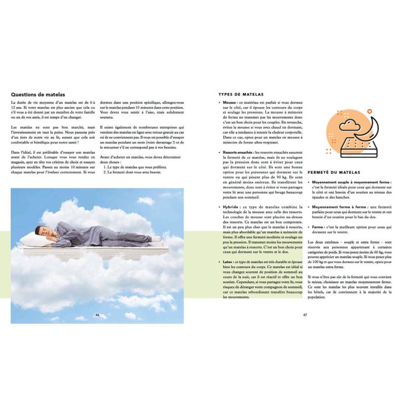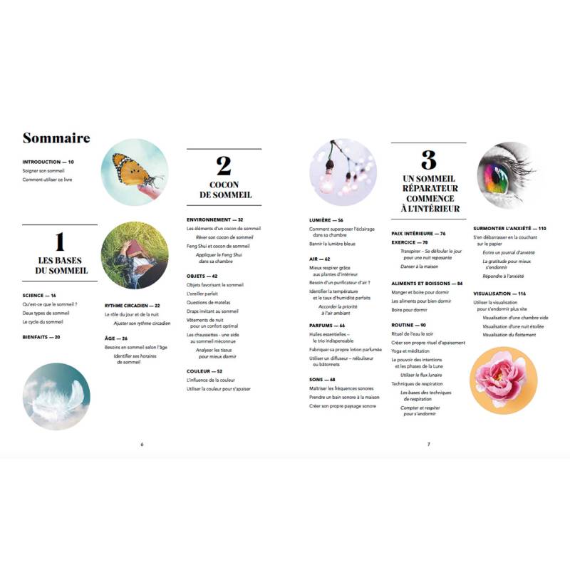 Tous les aspects à prendre en compte pour un meilleur sommeil sont abordés et expliqués : le cycle circadien, l'environnement, la literie, la lumière, l'air, l'alimentation, la relaxation, la lutte contre l'anxiété, les insomnies et les rêves, etc.