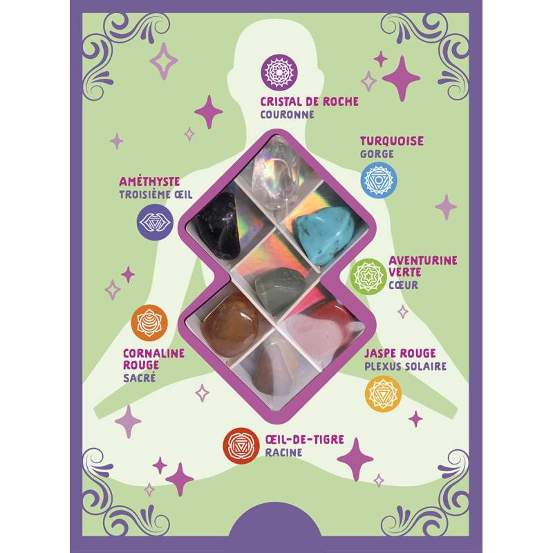 - Contient 7 cristaux destinés à agir sur chacun des chakras : quartz, turquoise, aventurine verte, jaspe rouge, oeil de tigre, cornaline rouge et améthyste.