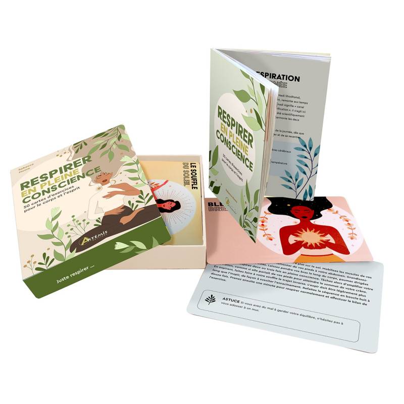 - Dans le livret, les généralités sur la respiration en pleine conscience ainsi que des compléments sur les exercices proposés par les cartes réparties selon 5 humeurs recherchées : concentration, relaxation, énergie, lâcher-prise, équilibre.