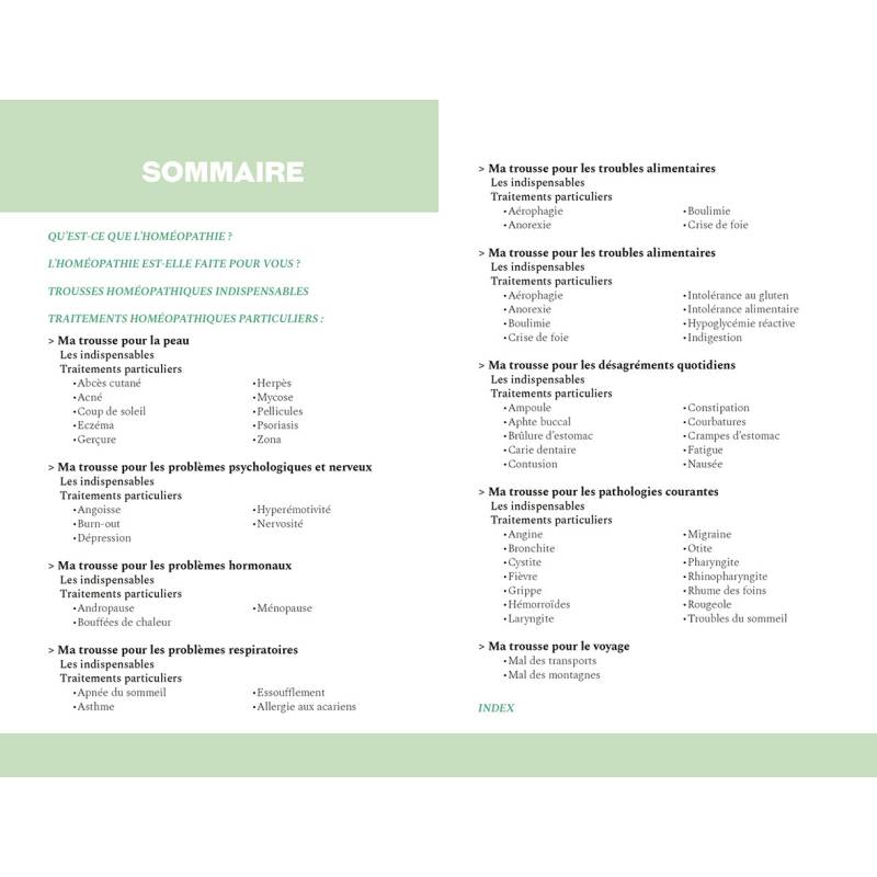 Le livre présente une introduction essentielle sur l'homéopathie, suivie de différentes trousses adaptées à des problématiques variées : trousse pour la peau, pour le voyage, les troubles alimentaires, les désagréments du quotidien ou encore les pathologies les plus courantes.