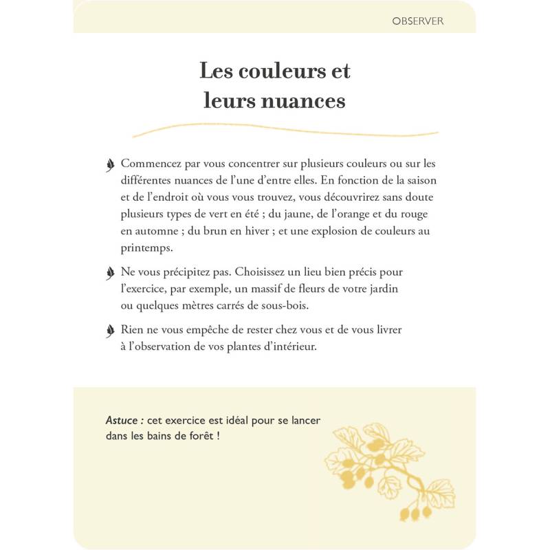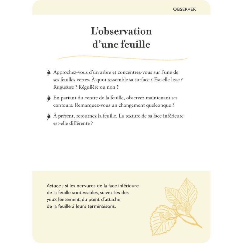 Les cartes proposent des exercices sensoriels simples et poétiques pour apprendre à observer, respirer, ressentir.