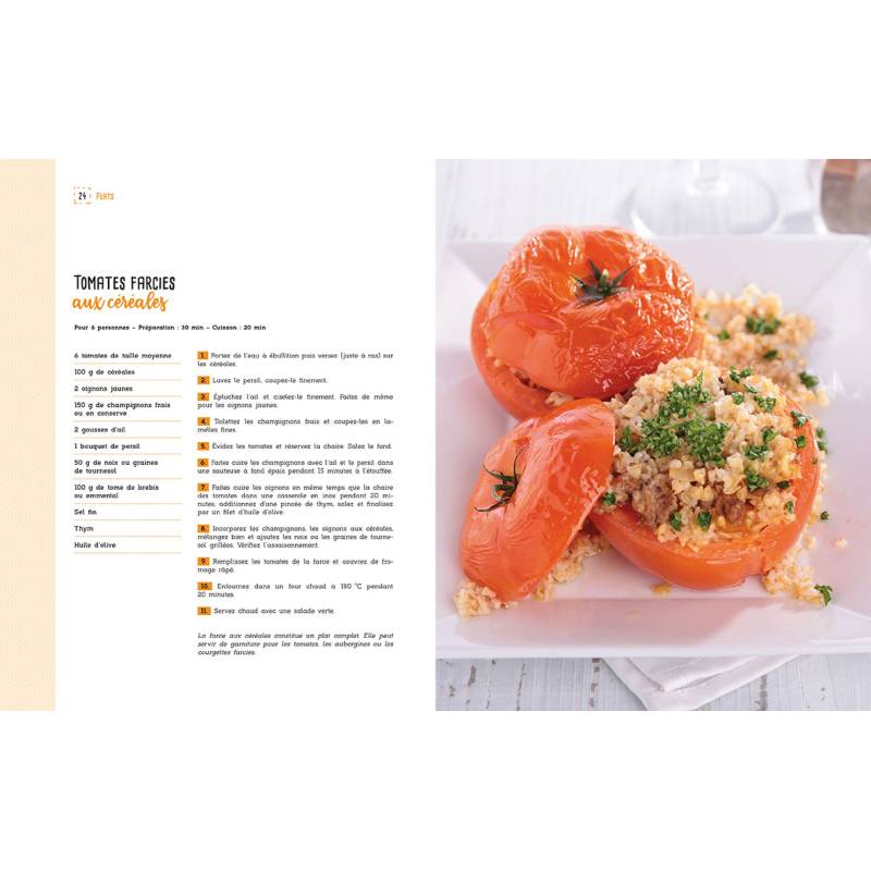 15 céréales différentes sont présentées et utilisées dans les recettes : sarrasin, avoine, orge, seigle, millet, blé, épeautre, etc., sous différentes formes (entières, flocons, farine, semoule).