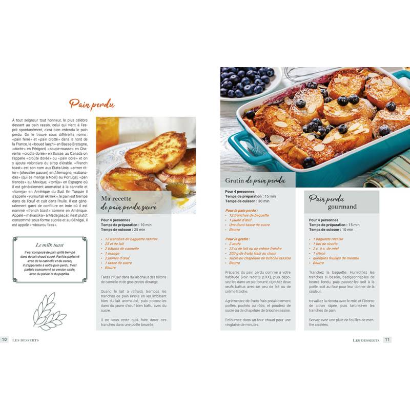 Plus de 100 recettes et astuces à base de pain, rassis ou frais : poivrons farcis, aubergines gratinées, bouchées de poulet au parmesan, saumon sauce grenobloise, sauce au pain, omelette au pain rassis, terrine de pain, soupe à l'oignon, etc.
