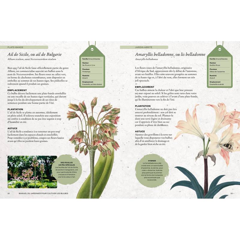Plus de 60 variétés et cultivars de bulbes décrits : hauteur, floraison, rusticité, emplacement, type de sol, plantation.