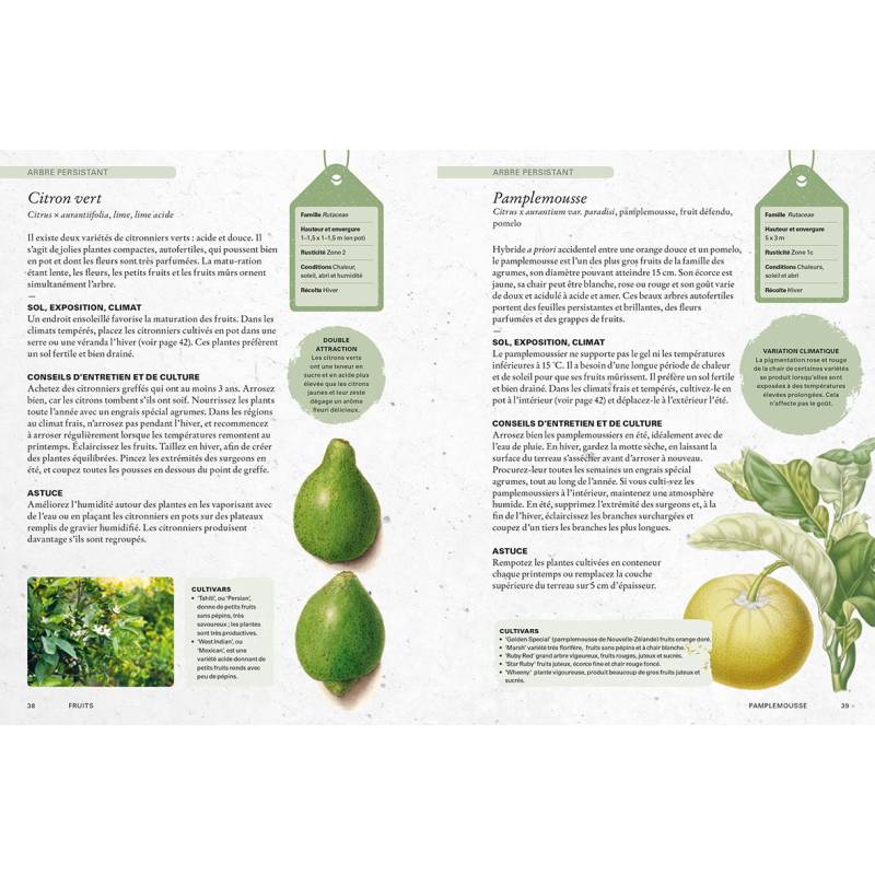 Plus de 40 variétés décrites : emplacement, sol, rusticité et climat, exposition, conseils de culture et plantation, entretien et taille, cultivars.