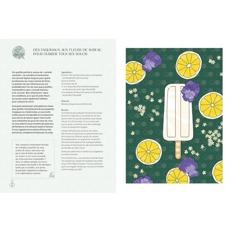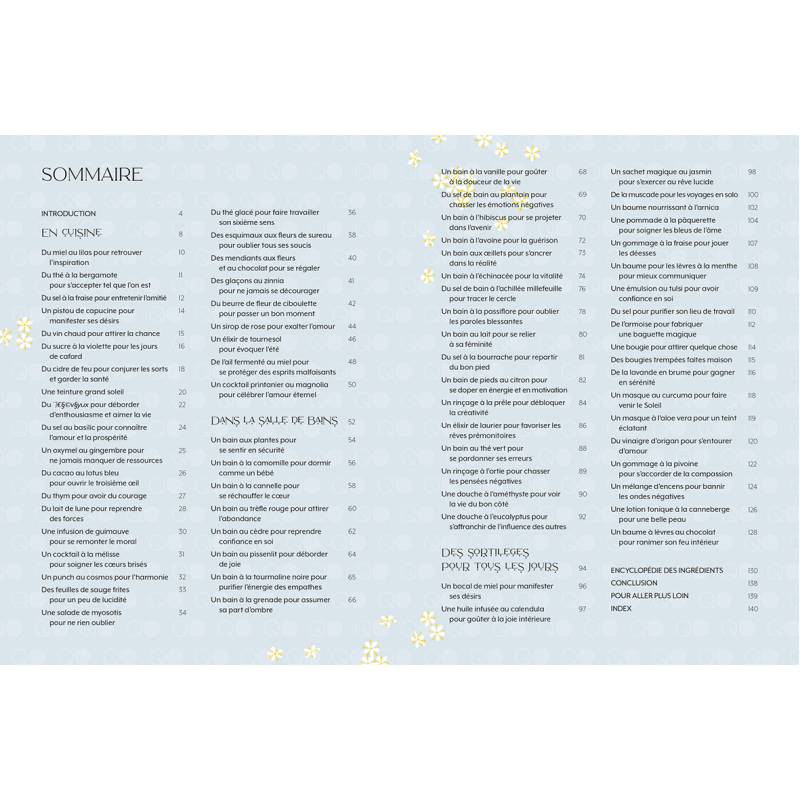 Quelques exemples de recettes : un sirop de rose pour exalter l'amour, une infusion de guimauve pour se remonter le moral, des esquimaux aux fleurs de sureau pour oublier tous ses soucis, un bain au thé vert pour se pardonner ses erreurs, de la lavande en brume pour gagner en sérénité, un mélange d'encens pour bannir les ondes négatives...