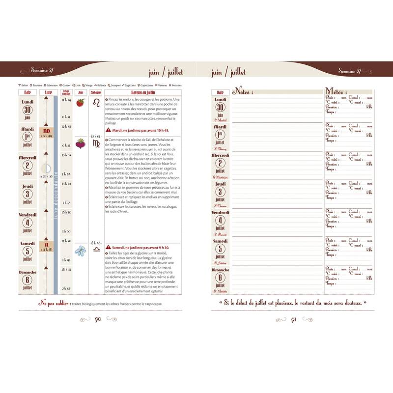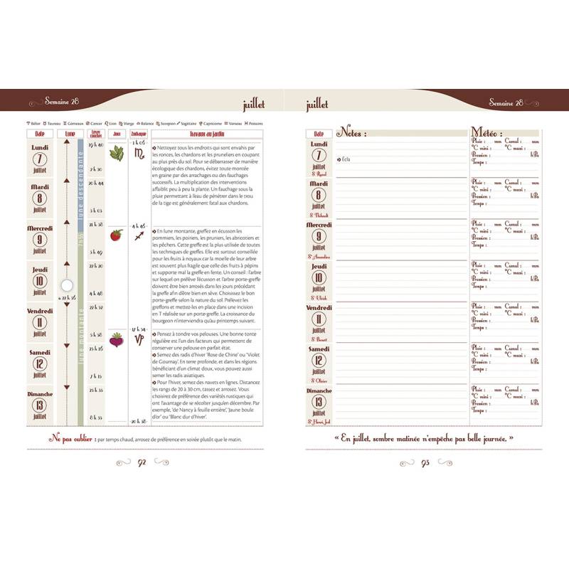 - Un espace pour les notes du jardinier : carnet météo à remplir jour après jour, notes personnelles, les saints à fêter et les dictions.