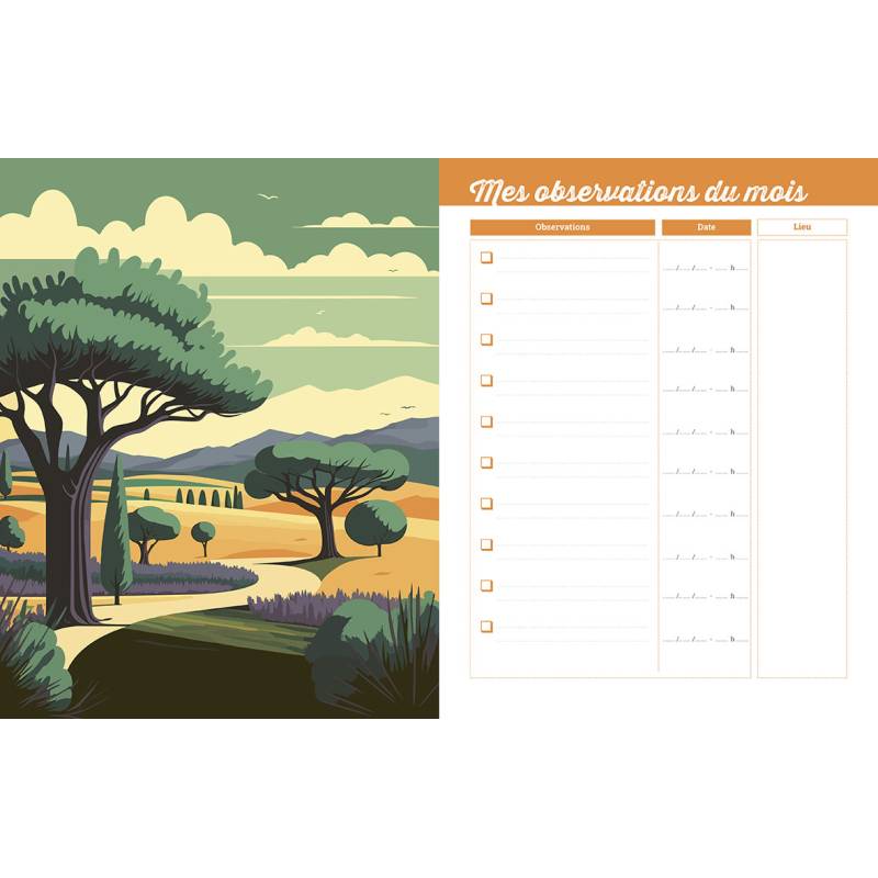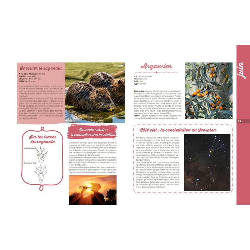 Chaque semaine, un calendrier avec des informations variées sur la nature : des fiches sur les plantes et les animaux, les règles de glanage et de balade en forêt, ainsi que des méthodes d'observation de la faune et de la flore, dans le respect de la biodiversité. Ce contenu inclut également des explications sur le balisage des sentiers, les plantes toxiques, des cycles naturels comme l'hibernation et un modèle d'herbier.