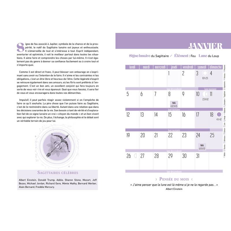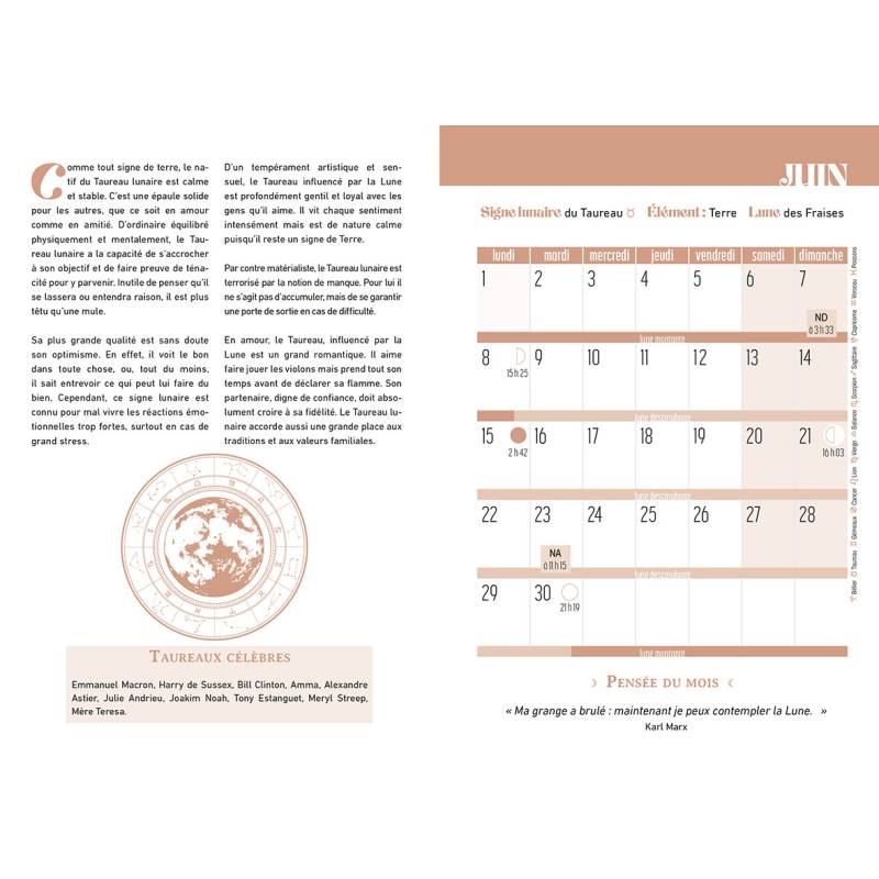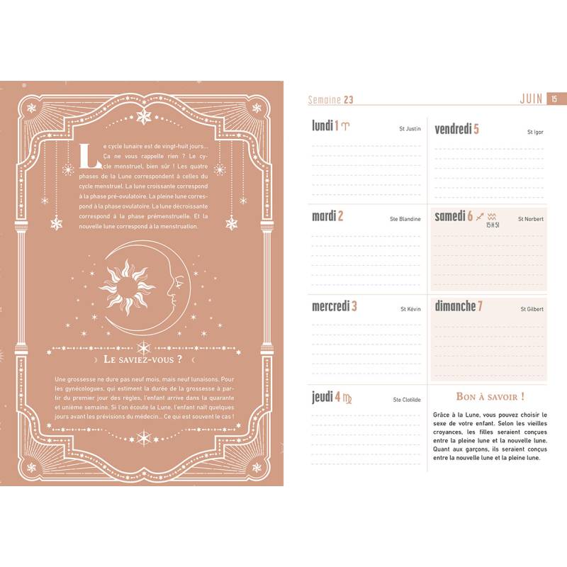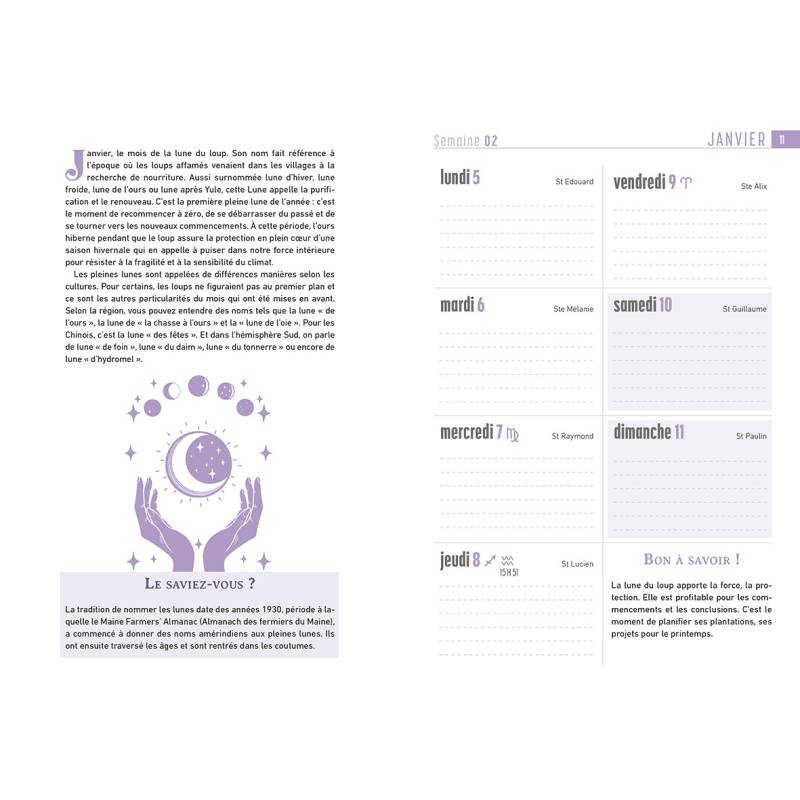 Une semaine par double-page, un espace pour chaque jour de la semaine pour noter les activités et les rendez-vous, ainsi que des conseils bien-être en rapport avec la Lune.